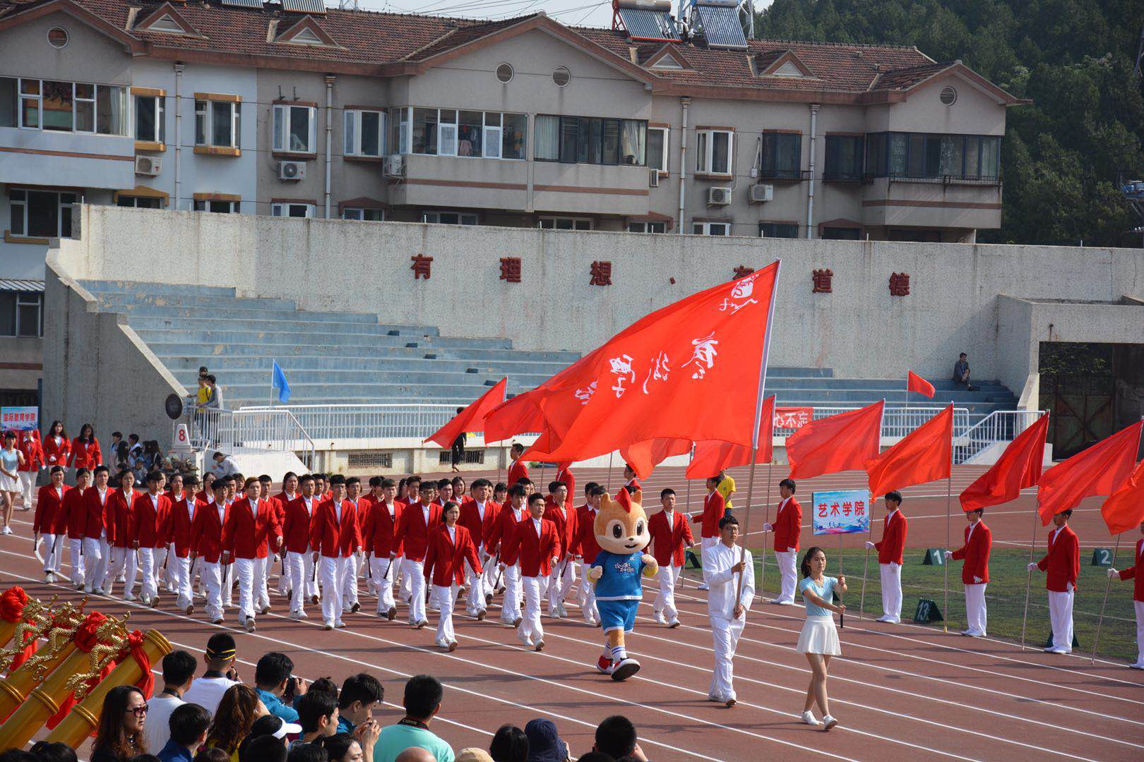 开幕式上,伴随着庄严的歌声、随风舞动的彩旗,我院学生手执大家亲手绘制的水墨丹青折扇,迎着朝阳,踏着整齐的步伐入场。展现出我院学生斗志昂扬,财艺双全的艺术学子风采。
