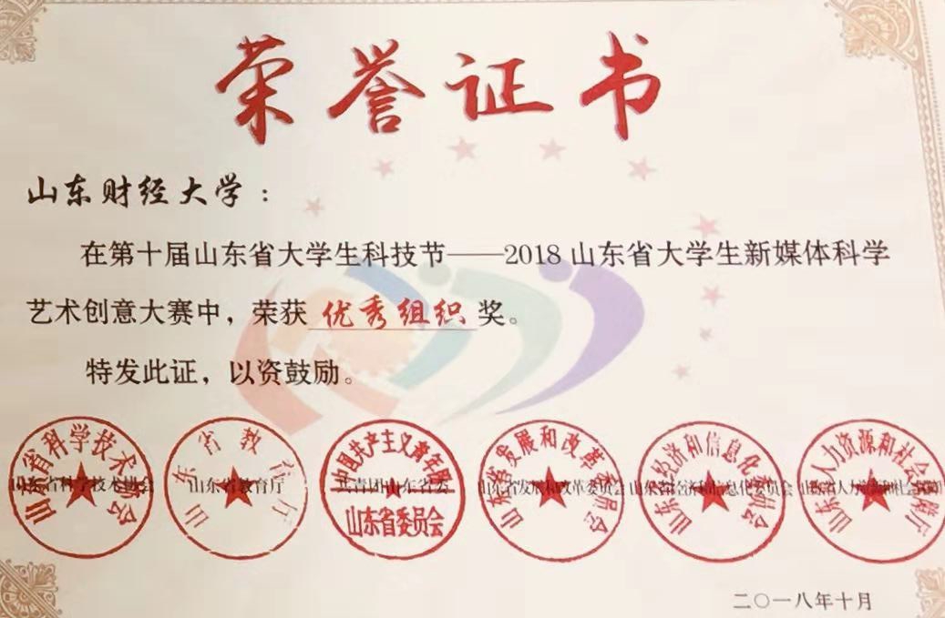 日前,由省科学技术协会、省人力资源和社会保障厅、省教育厅、团省委、省经济和信息化委员会、省发展和改革委员会联合主办的“2018年山东省大学生新媒体科学艺术创意大赛”在济南落幕,我校喜获一等奖1项、二等奖2项,三等奖2项,优秀奖11项,我院青年教师马洪骥获“优秀指导教师”,我校获“优秀组织单位”,各项成绩居全省参赛本科院校前列。