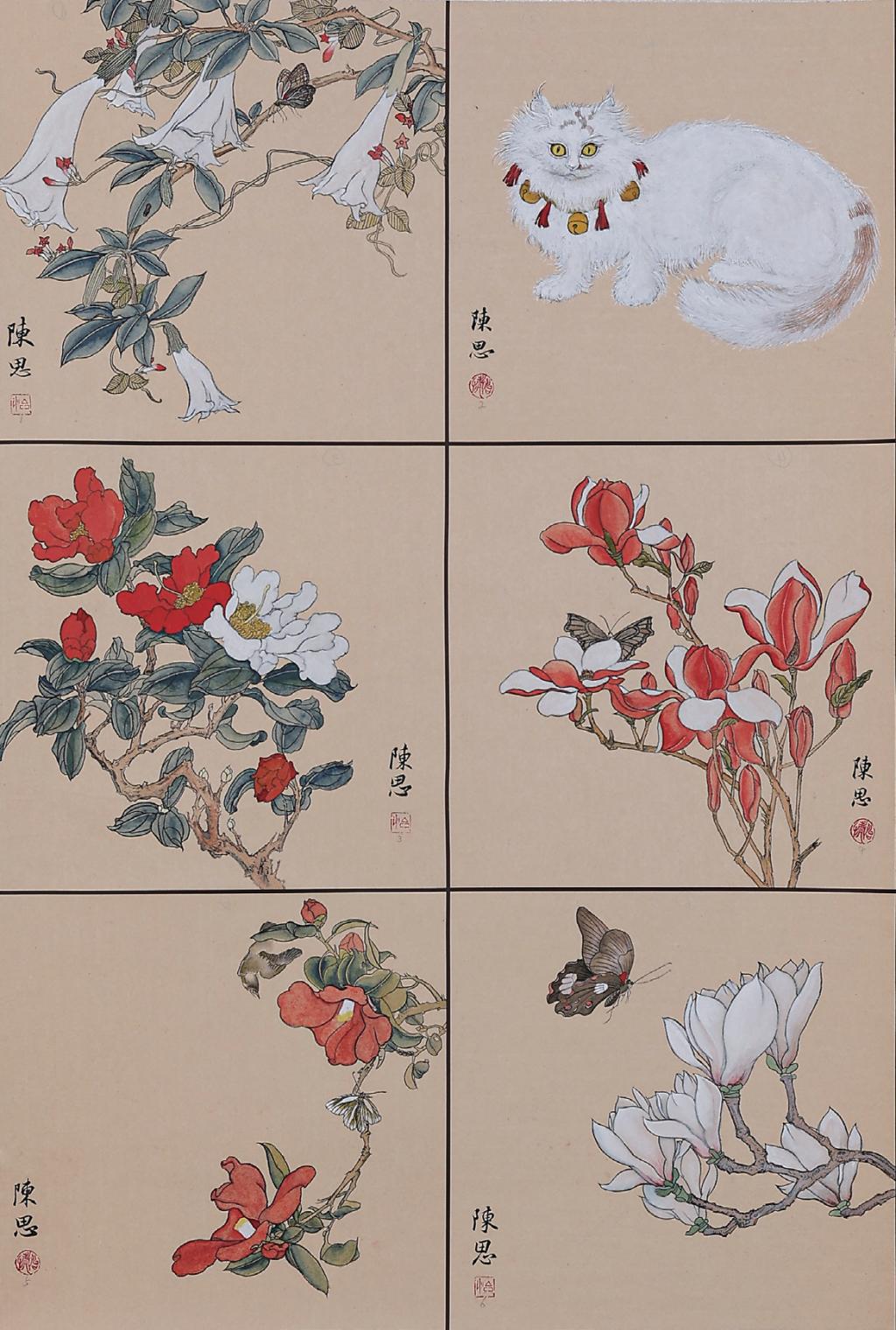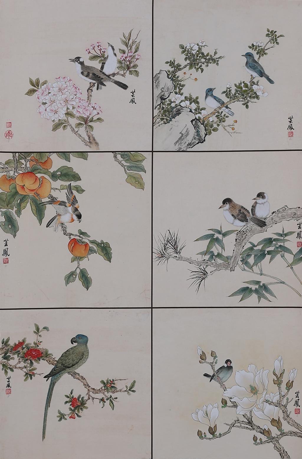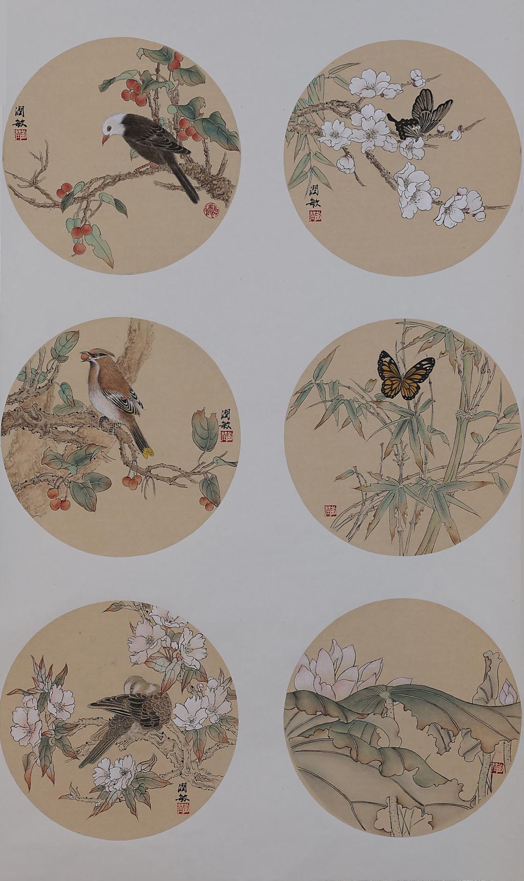 整幅 6 块小品,借鉴陈洪绶花鸟册页中的典型形象进行重新拼凑,创作。没有刻意追求工整的效果,整体作品粗狂放达,线条形散而神不散,设色直白中见精妙。整体上渴望能够体现出对于花鸟画最初的朴素认知,希望达到一种面目粗糙但和谐一致的效果。