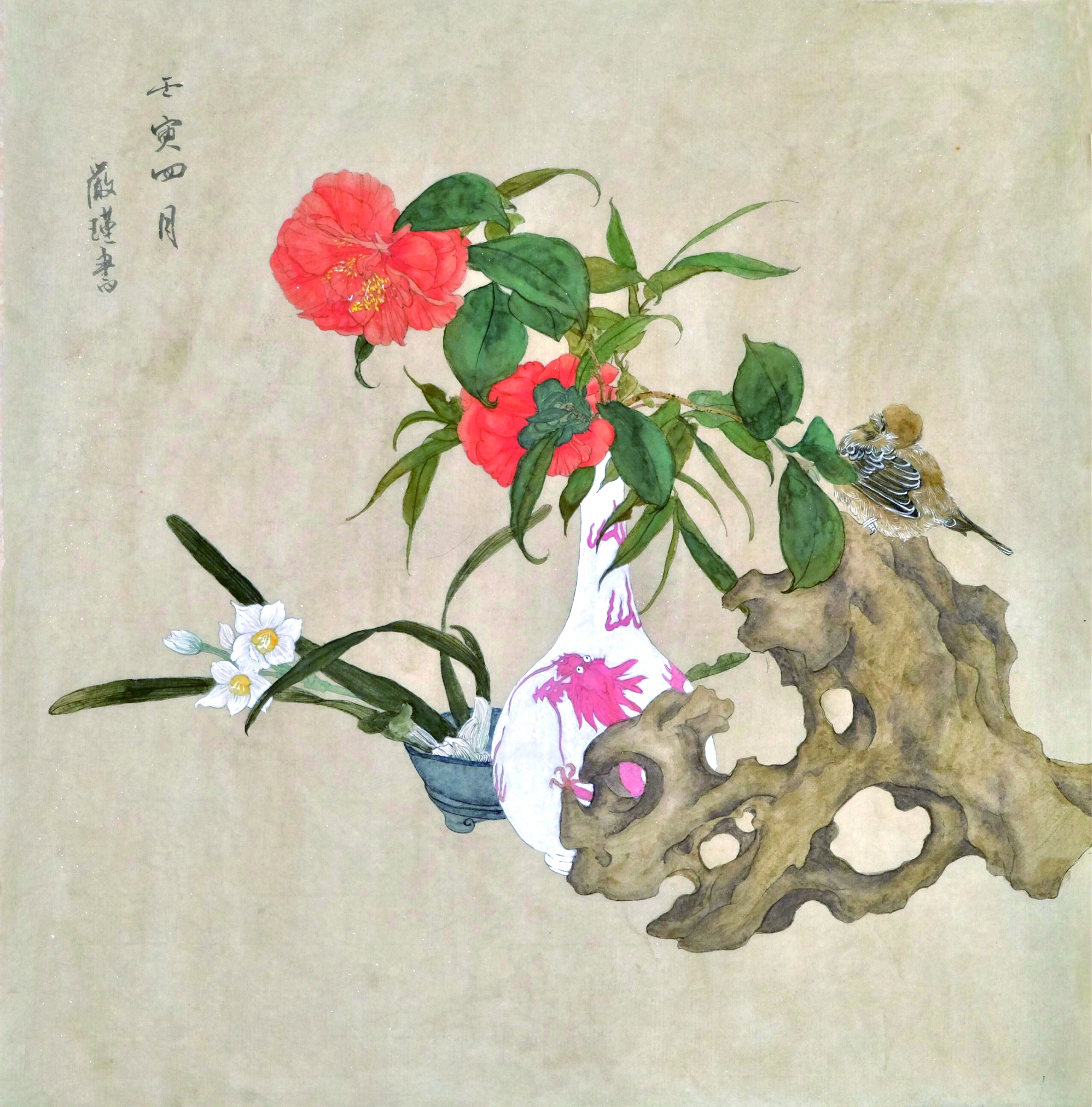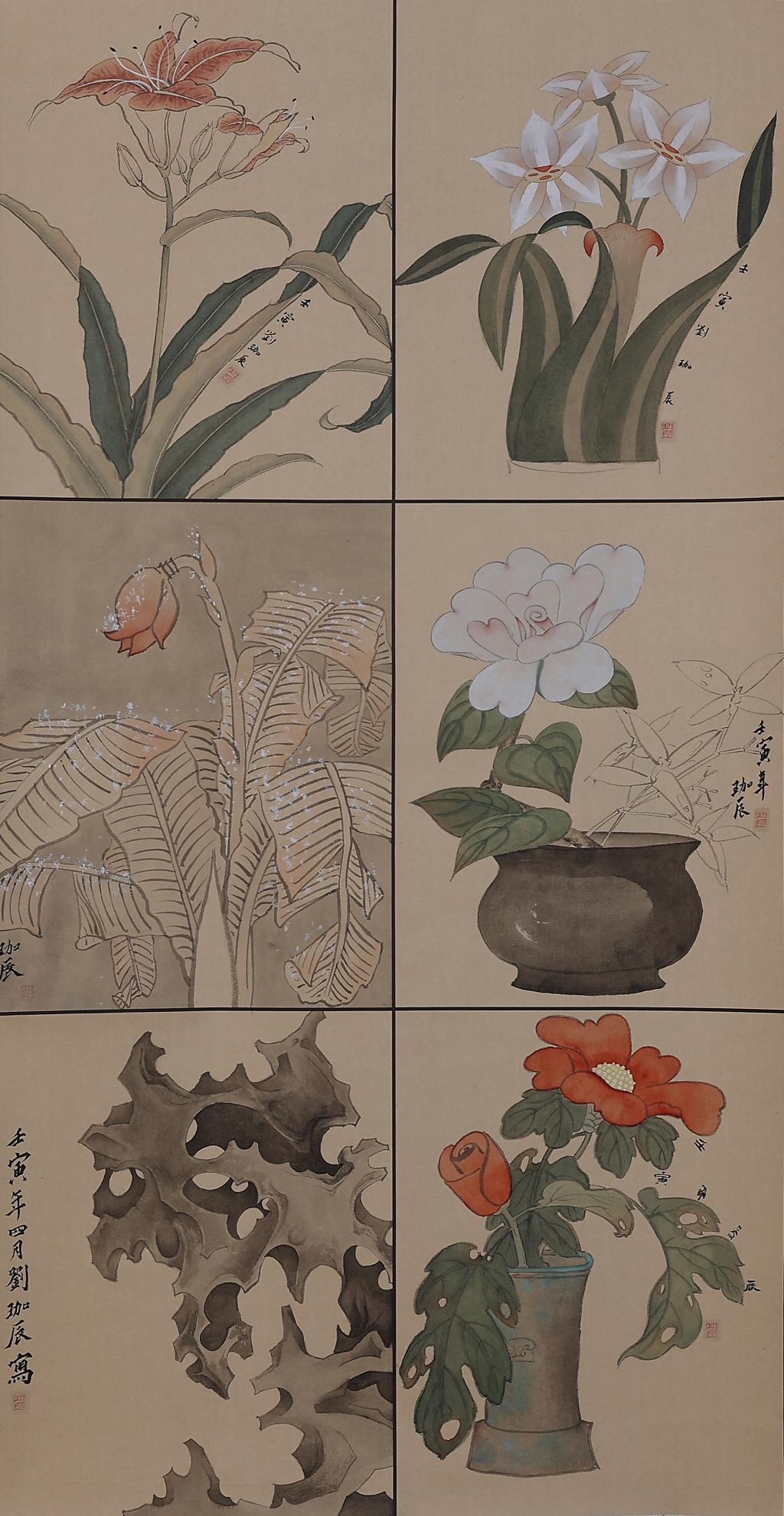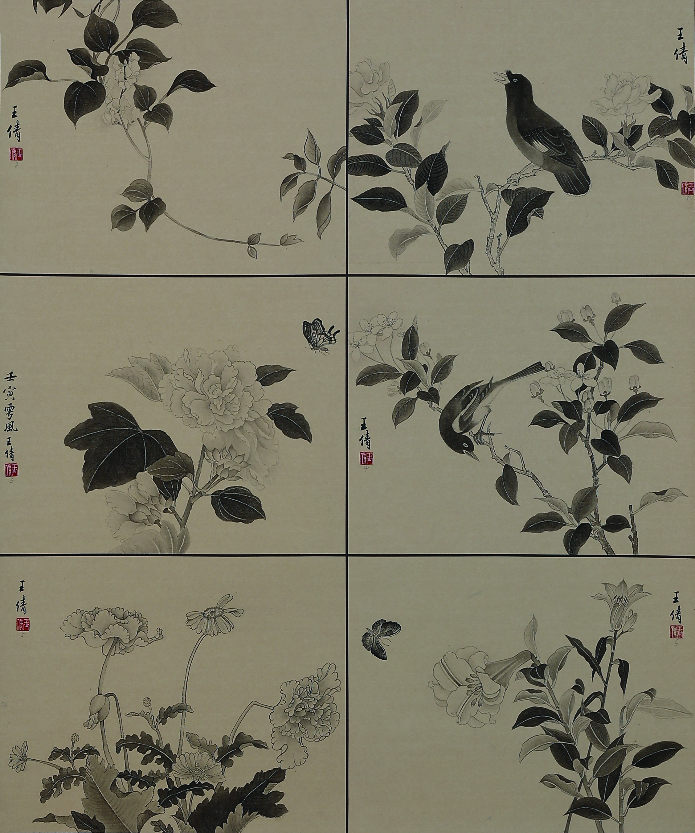 整幅 6 块小品,借鉴陈洪绶花鸟册页中的典型形象进行重新拼凑,创作。没有刻意追求工整的效果,整体作品粗狂放达,线条形散而神不散,设色直白中见精妙。整体上渴望能够体现出对于花鸟画最初的朴素认知,希望达到一种面目粗糙但和谐一致的效果。