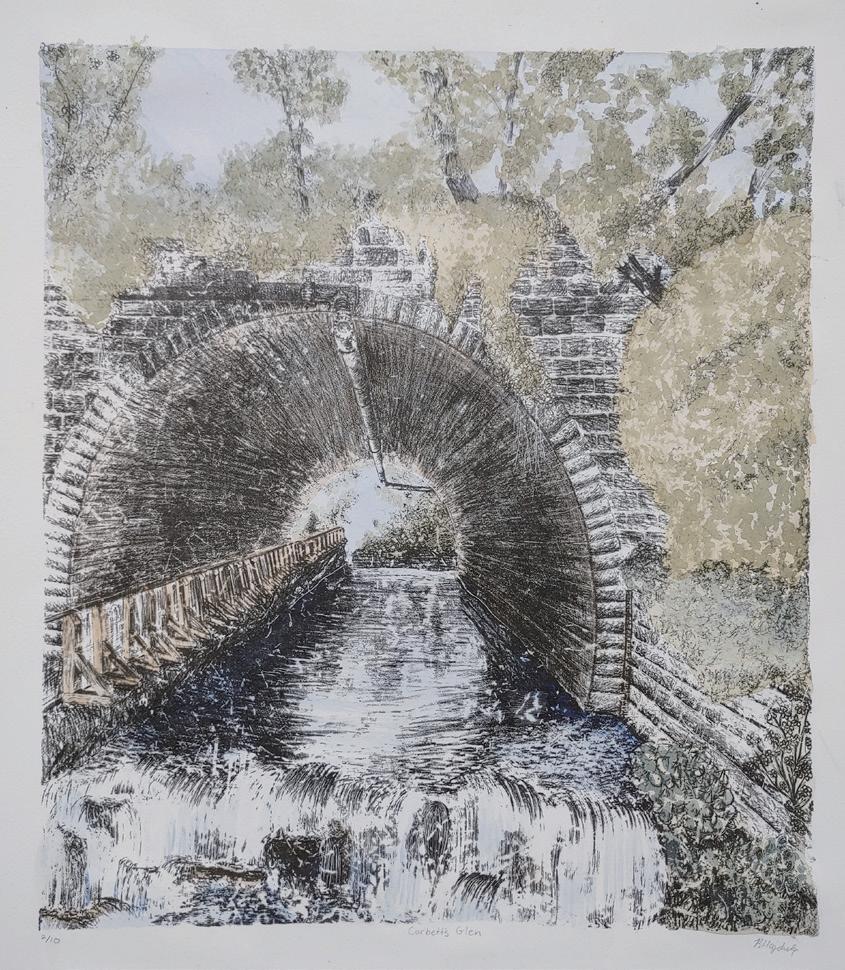 My work explores the dichotomy between the organic chaos of nature and the geometric organization of man-made architecture. I apply a streamofconsciousmethod to monoprints, as I spontaneously alter the ink on the plate. Combining impulsivity with diligence creates a unique combination of textures and atmospheres wintin my work. My work is heavily inspired by architecture and nature trails around Rochester. Printmaking techniques such as hand coloring lithographs, continue to inspire me by referencing Currier and Ives, from the nineteenth century.