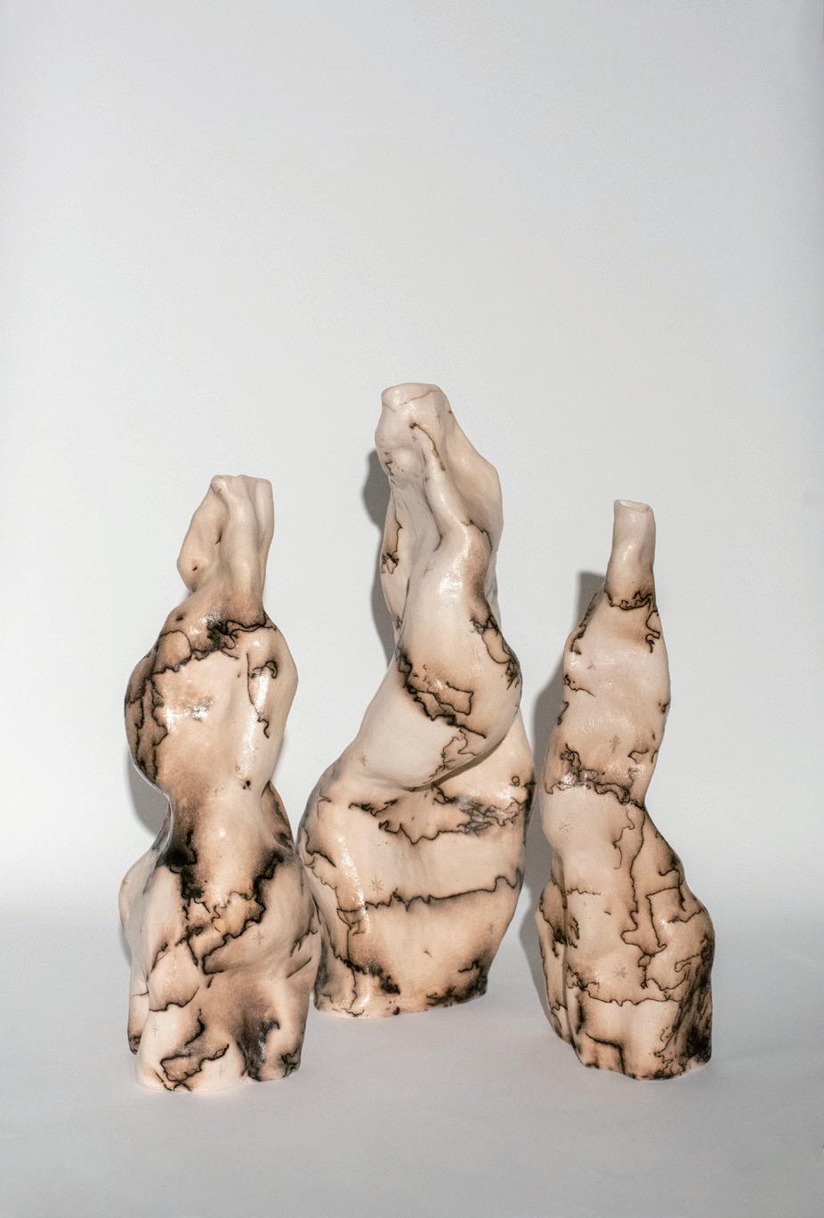 I was inspired by the flow of the universe and the curves of the body for this piece Voluminous shapesand curving lines merging together to create a form that at some angles resembles the human bodyThe organic shapes created also resemble clouds and remind me of the sky on a starry night .