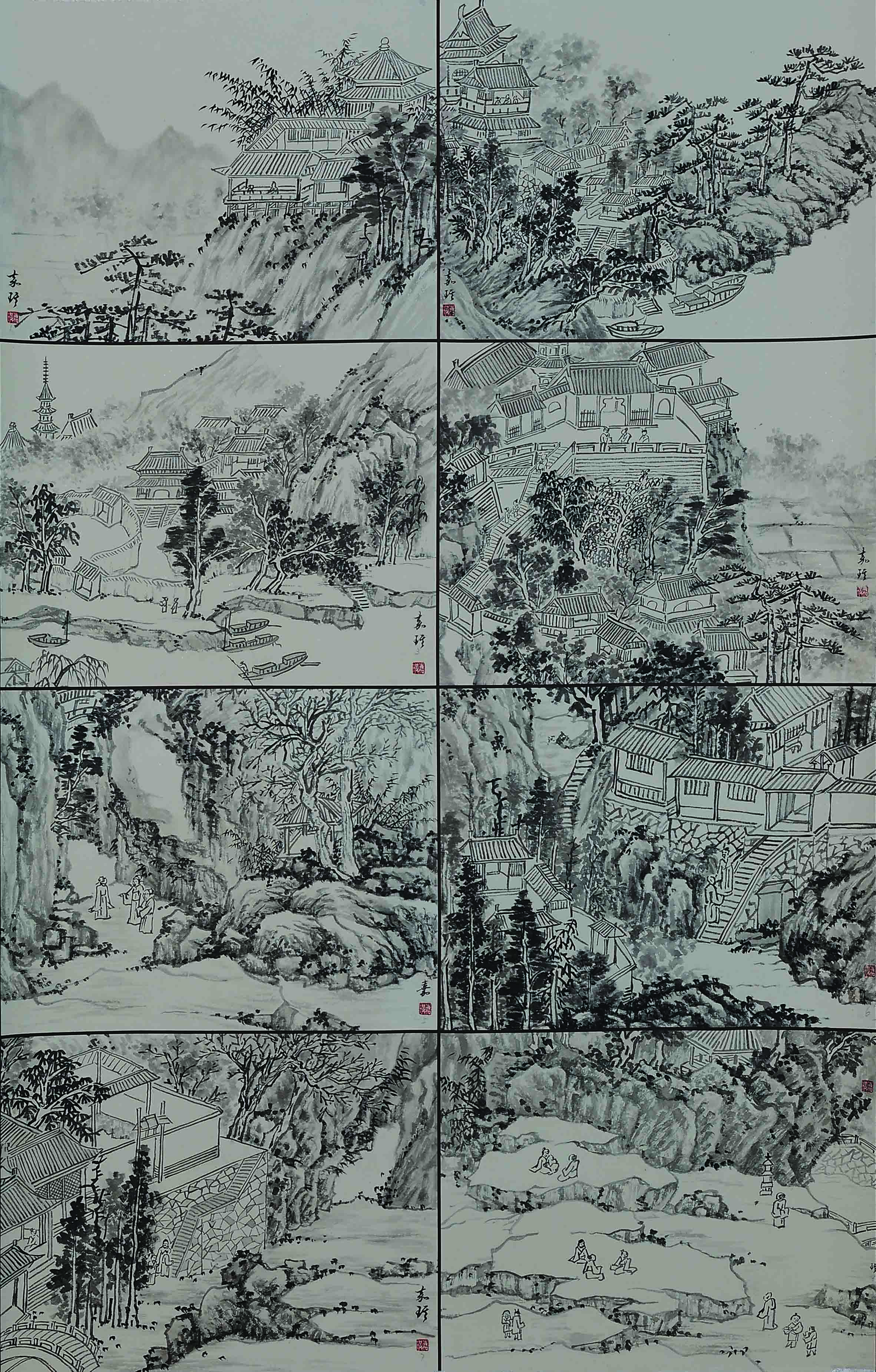 整幅六副小品山水,寻明人之笔意,描绘了优美宁静的中国古代田园风光。山水小品是中国山水画的重要品类之一,它小中见大,它代表了古代文人的精神追求,又抒发其闲情雅致之心。小品画具有“尽精微,致广大”的特点。