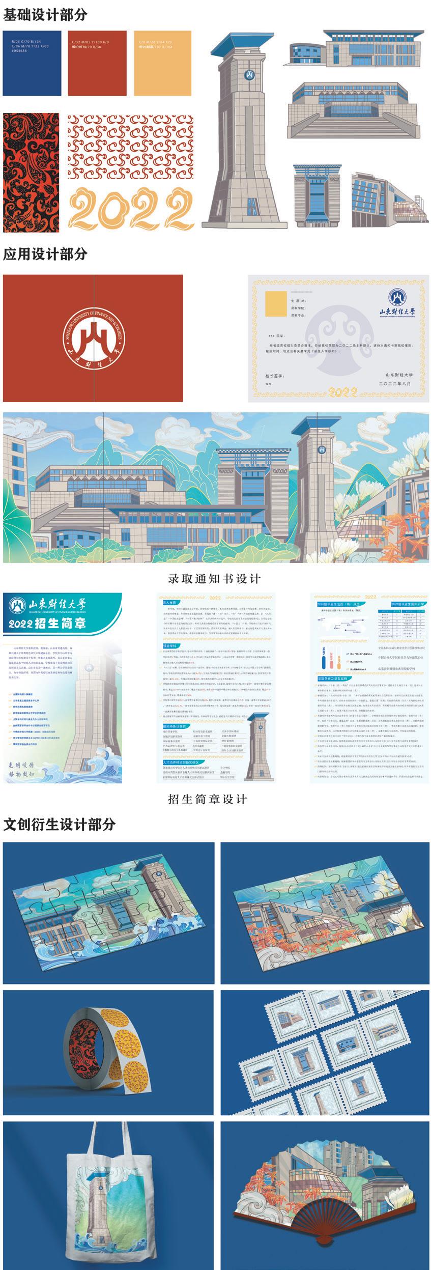 This is a series of design by Shandong university of finance and economics admissions service image of the design work, the purpose is through to the shandong university of finance and economics admissions service visual image of a unified visual planning, to further arouse the relevant audience appeal at a deeper level, and enhance the centripetal force of teachers and students in the university, and to give a unified visual image in society. The main design element in the design works is the campus landmark building of Shandong University of Finance and Economics. The design of auxiliary graphics in the basic design part is inspired by the cloud gas pattern in the traditional pattern, and forms a unified design language with the image of "cloud sky" and "fertile soil" in the CAMPUS VI system of Shandong University of Finance and Economics. In the application design part, mainly for the design of admission notice and enrollment brochure, the design form is to show the campus architecture and campus scenery through the image of illustration, and applied in it, but also the corresponding cultural and creative derivative design, the purpose is to better serve the recruitment work of Shandong University of Finance and Economics.