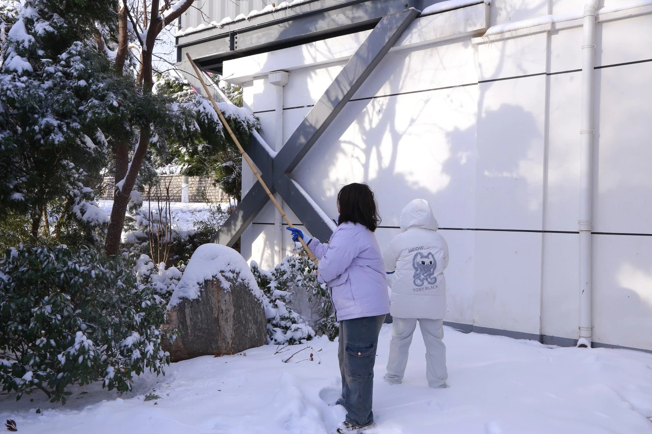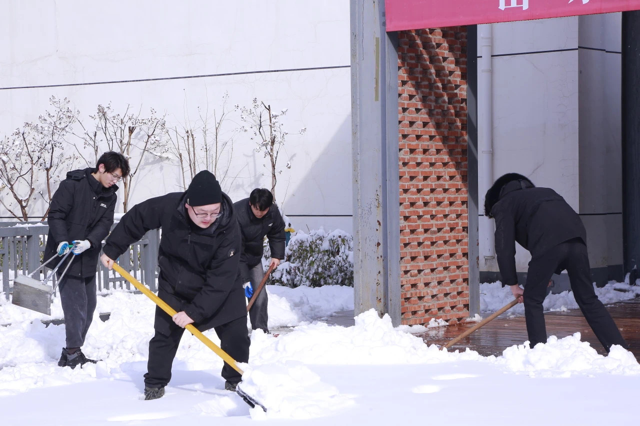 春寒料峭,积雪成冰。早上8点,志愿者们手持雪铲、刮冰刀等工具,迅速投入清扫工作。大家分工协作,有的奋力铲除主干道坚冰,有的细心清理台阶暗冰,有的转运积雪至绿化带……经过奋战,学院主要通道、美术馆前广场及停车场等区域被清理得干净畅通,为师生开辟出"安全路"。下午5点,继续组织志愿者开展校园公共区域积雪清扫工作,保障师生安全出行。