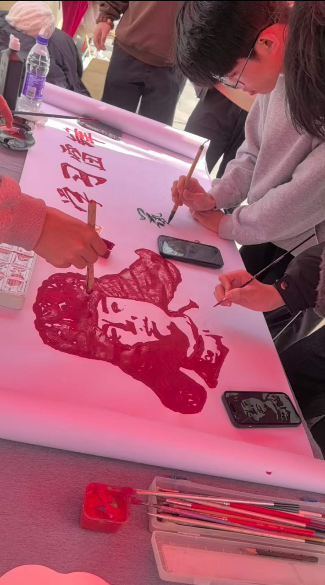 整场活动内容丰富多样,包括绘画创作、编织坐垫及志愿服务讲解等环节。艺院学子们用自己的画笔,结合专业特长,通过绘画、书写等形式,表达了对雷锋精神的理解与传承。精美的艺术作品吸引了众多学生观看参与,通过现场抽取问答等环节,同学们获得了漆扇、字帖等既体现雷锋精神又饱含艺术特色的手工品。在绘画环节,艺院学子们齐心协力,共同完成了一米有余的雷锋头像画卷。从填色到细节描绘,每位同学都倾注了自己的心血与热情。这幅画卷不仅是一件艺术作品,更是全体参与者学习雷锋精神的生动见证。