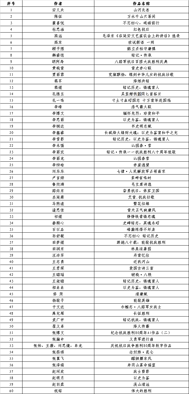 纪委、监察专员办公室,党委宣传部与艺术学院联合举办的纪念中国人民抗日战争暨世界反法西斯战争胜利80周年“以史为鉴•铸魂育人”作品展,经过作品征集与评审环节,现已确定入展作品名单。