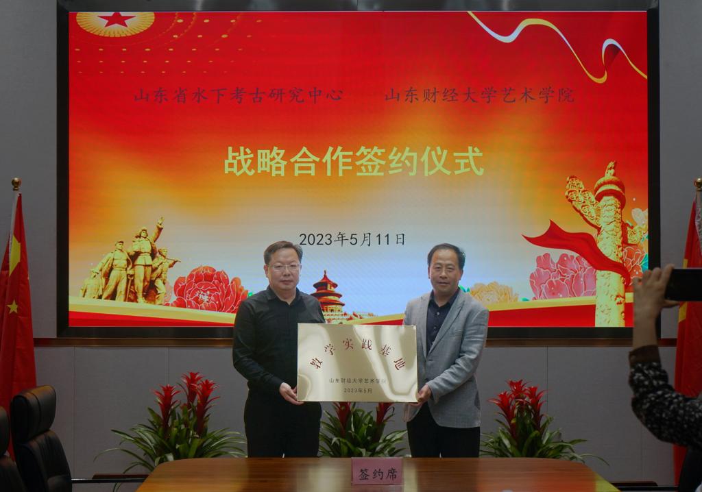 为进一步加强学科建设,促进专业发展,5月11日,艺术学院与山东省水下考古研究中心签订全面合作框架协议,水下考古研究中心主任刘延常、副主任杨勇,办公室主任张宾,学术交流与信息部主任魏泽华,艺术学院领导班子,教师代表参加签约仪式,仪式由水下考古研究中心副主任杨勇主持。刘延常欢迎艺术学院一行到访研究中心并参加签约和揭牌仪式,他介绍了研究中心的历史沿革和事业发展情况,畅谈了双方加强合作,共同推进艺术品挖掘与鉴定工作,特别是加强专业人才培养的计划和构想;艺术学院副院长(主持工作)宋述林感谢研究中心多年来对学院教学、实践、教师培训等工作的支持和帮助,介绍了学院在学科建设、专业设置、人才队伍、科学研究、学生培养等方面的基本情况和多年秉持的“艺术+财经”的办学特色及取得的主要成绩;党委书记杨扬对以刘延常主任为代表的研究中心始终葆有的参与高等教育、培养专门人才责任和情怀表示钦佩,希望双方进一步拓展合作思路,优势互补,资源共享,在专业教学、实践实训、教师发展、参与社会公益活动等方面加强合作;希望能借助涉水文化遗产保护学会等学术平台,有力推动艺术学院美术学等专业的发展,提升学科影响力和人才培养质量;更希望能通过合作,带动更多的专业教师和青年学生参与到文物发掘与整理、艺术品鉴定与研究工作中去,为弘扬中华民族传统文化做出积极贡献。