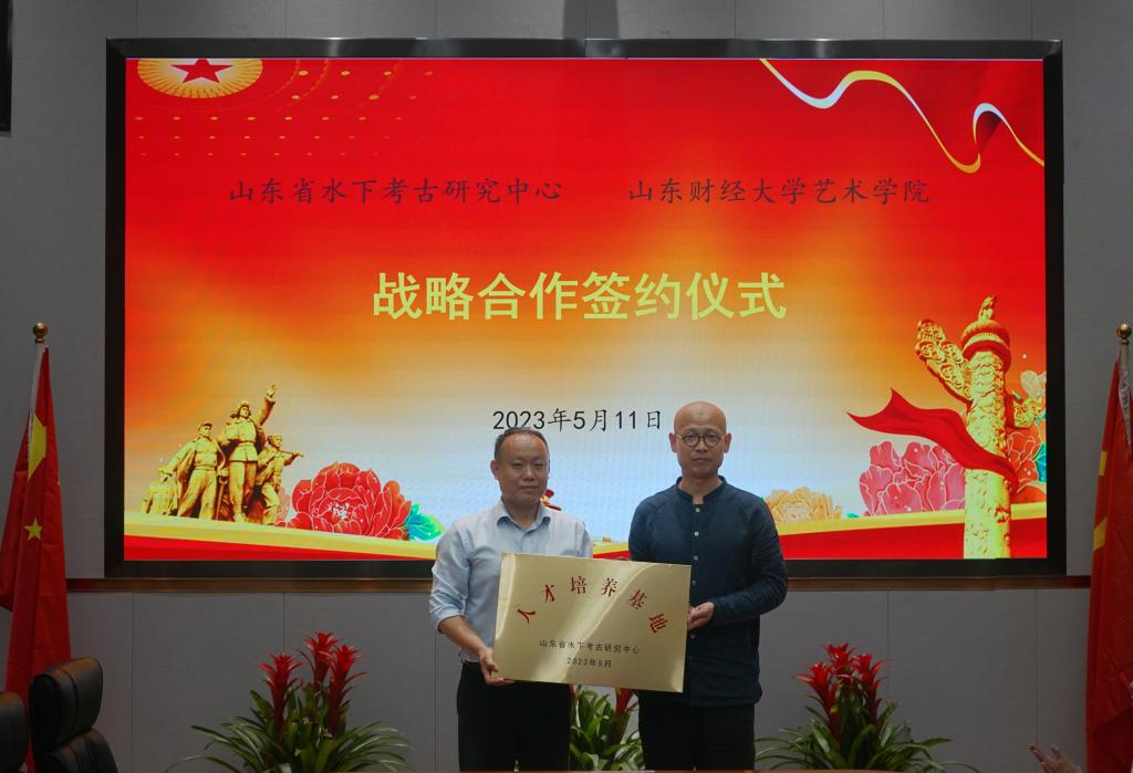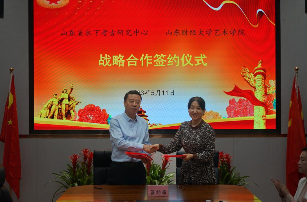 为进一步加强学科建设,促进专业发展,5月11日,艺术学院与山东省水下考古研究中心签订全面合作框架协议,水下考古研究中心主任刘延常、副主任杨勇,办公室主任张宾,学术交流与信息部主任魏泽华,艺术学院领导班子,教师代表参加签约仪式,仪式由水下考古研究中心副主任杨勇主持。刘延常欢迎艺术学院一行到访研究中心并参加签约和揭牌仪式,他介绍了研究中心的历史沿革和事业发展情况,畅谈了双方加强合作,共同推进艺术品挖掘与鉴定工作,特别是加强专业人才培养的计划和构想;艺术学院副院长(主持工作)宋述林感谢研究中心多年来对学院教学、实践、教师培训等工作的支持和帮助,介绍了学院在学科建设、专业设置、人才队伍、科学研究、学生培养等方面的基本情况和多年秉持的“艺术+财经”的办学特色及取得的主要成绩;党委书记杨扬对以刘延常主任为代表的研究中心始终葆有的参与高等教育、培养专门人才责任和情怀表示钦佩,希望双方进一步拓展合作思路,优势互补,资源共享,在专业教学、实践实训、教师发展、参与社会公益活动等方面加强合作;希望能借助涉水文化遗产保护学会等学术平台,有力推动艺术学院美术学等专业的发展,提升学科影响力和人才培养质量;更希望能通过合作,带动更多的专业教师和青年学生参与到文物发掘与整理、艺术品鉴定与研究工作中去,为弘扬中华民族传统文化做出积极贡献。